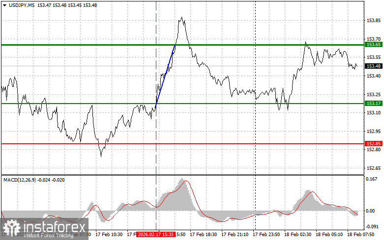 Сценарий №2: покупать USD/JPY сегодня также планирую в случае двух подряд тестов цены 153.43 в момент, когда индикатор MACD будет находиться в области перепроданности. Это ограничит нисходящий потенциал пары и приведет к обратному развороту рынка вверх. Можно ожидать рост к противоположным уровням 153.61 и 153.93.
