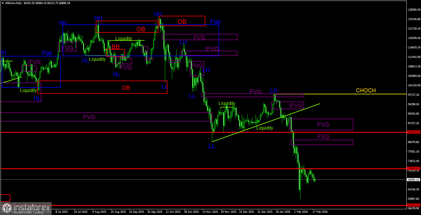 Биткоин продолжает формирование полноценного нисходящего тренда. Мы продолжаем ожидать падения с целью 57 500$(уровень 61,8% по Фибоначчи от трехлетнего восходящего тренда), а признаков разворота тренда в данное время ни одного. Но даже уровень 57 500$ теперь не выглядит, как конечная остановка. Из областей POI на продажу на дневном ТФ можно отметить последний «медвежий» FVG, до которого биткоину еще очень далеко. На 4-часовом ТФ имеется три неотработанных «медвежьих» FVG, однако эти паттерны принадлежат к предыдущему движению и располагаются гораздо выше текущей цены. Они вряд ли спровоцируют возобновление тренда. В любом случае биткоин пока не может скорректироваться.