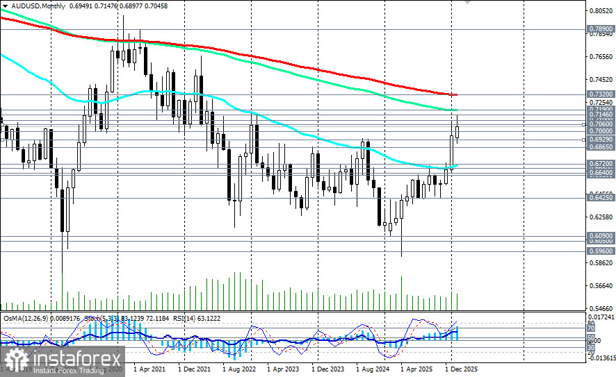 AUD/USD может продолжить рост в направлении 0.7100 – 0.7190 (ЕМА144 на месячном графике), сохраняя бычий уклон при коррекциях к поддержкам. Дальнейший рост и пробой стратегических уровней сопротивления 0.7300, 0.7320 (ЕМА200 на месячном графике) выведет цену в зону глобального бычьего рынка, открыв цене дорогу в сторону локальных уровней сопротивления 0.7900, 0.8000 (максимумы 2021 года), 0.8100 (максимумы 2018 года).