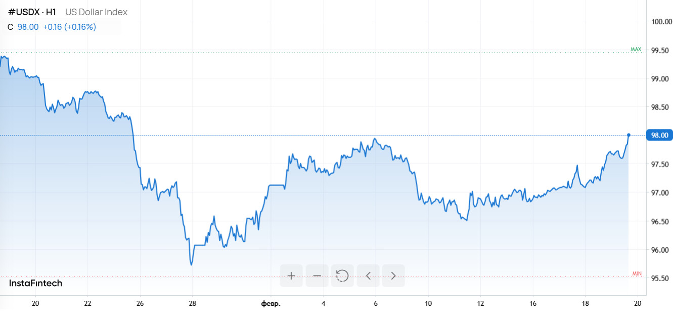 Итак, к 14:29 по Гринвичу индекс доллара, отслеживающий курс американской валюты к корзине шести валют, снизился на 0,1% до 98,01. На предыдущей сессии индекс подскочил примерно на 0,6%, отыграв часть падения с недавних минимумов.