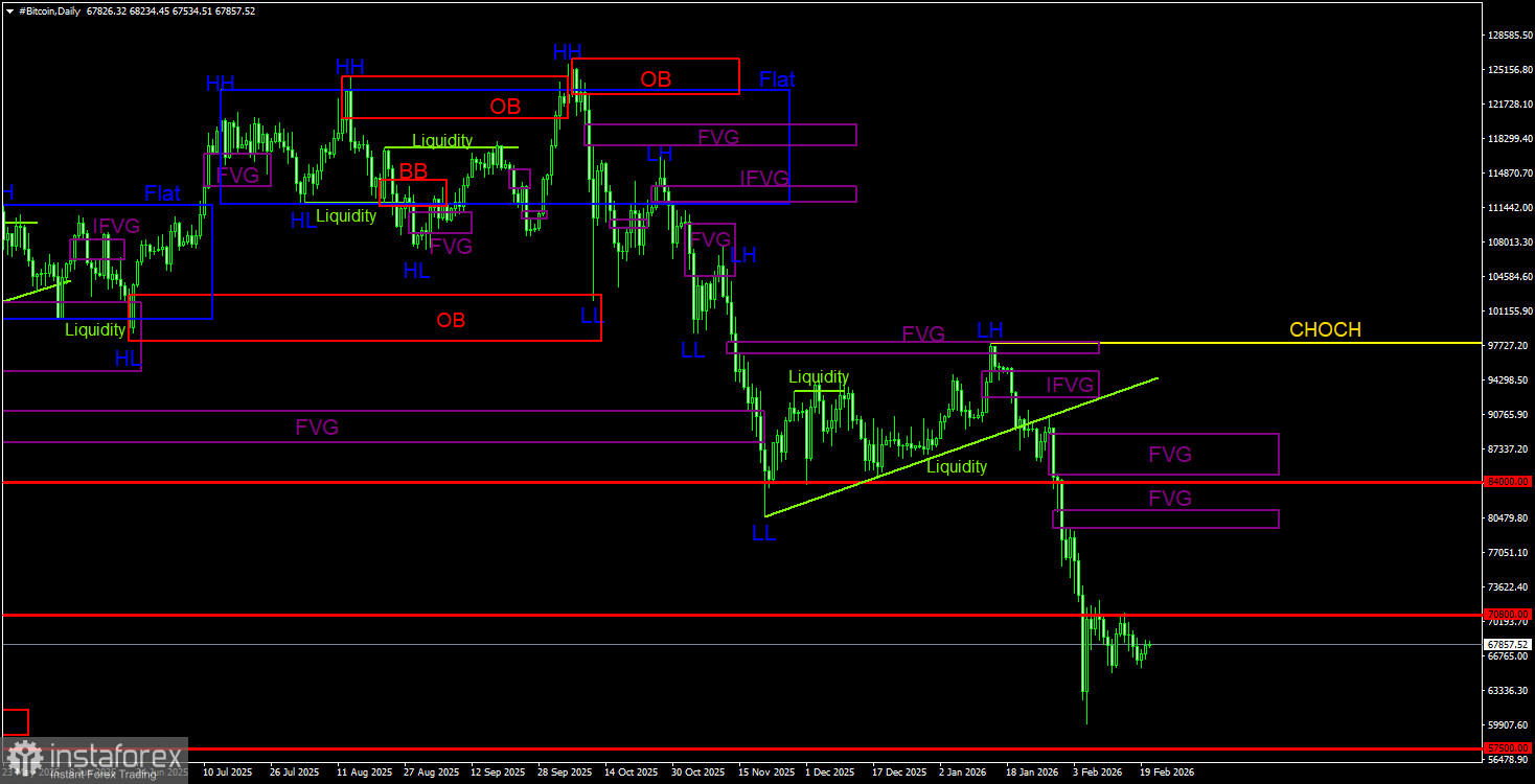 На дневном ТФ биткоин продолжает формирование нисходящей тенденции. Структура тренда идентифицируется, как нисходящая, а линия CHOCH в данное время проходит на уровне 97 900$. Только выше этого уровня можно будет считать, что нисходящий тренд завершен. Напомним, что сигнал на продажу был сформирован внутри «медвежьего» FVG(96 900$ – 98 000$) и получил подтверждение на младшем ТФ. Таким образом, трейдеры имели прекрасную возможность забрать практически все последнее движение вниз. Текущей целью остается уровень 57 500$ – 61,8% по Фибоначчи. Так как признаков разворота нет, мы считаем, что падение будет продолжено. На дневном ТФ ближайшая область POI для новых сделок на продажу находится в диапазоне 79 500$ – 81 100$, но до нее биткоину еще нужно добраться.