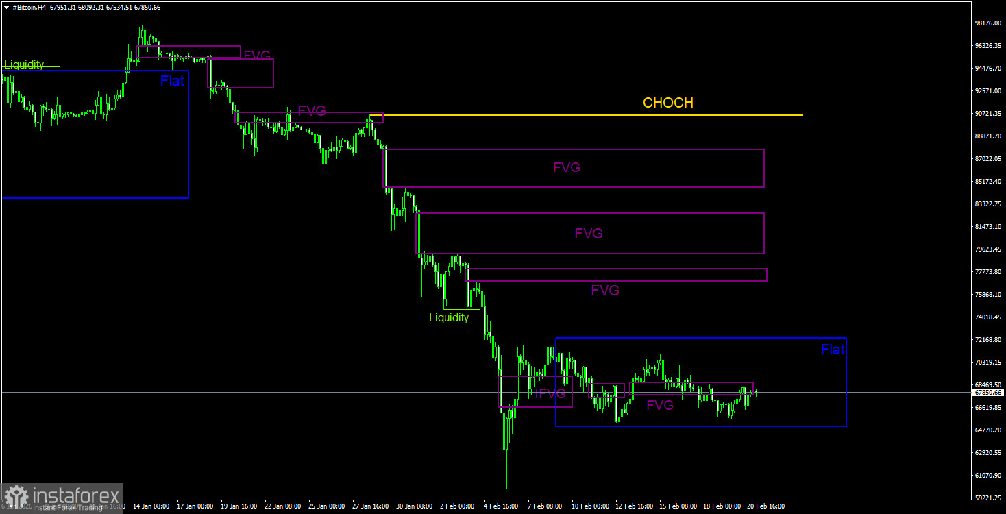 На 4-часовом таймфрейме цена также продолжает формирование нисходящей структуры. Линия CHOCH проходит на уровне 90 560$, только выше нее можно будет говорить о преобразовании тренда в восходящий. Однако на данный момент нет никаких признаков того, что биткоин может завершить падение в ближайшее время. Все последние паттерны FVG не дали никакой ощутимой реакции. Мы считаем, что в данное время на 4-часовом ТФ сформировался флэт. Следовательно, торговые позиции можно рассматривать только в случае образования девиаций, которых в последнее время тоже не было ни одной.