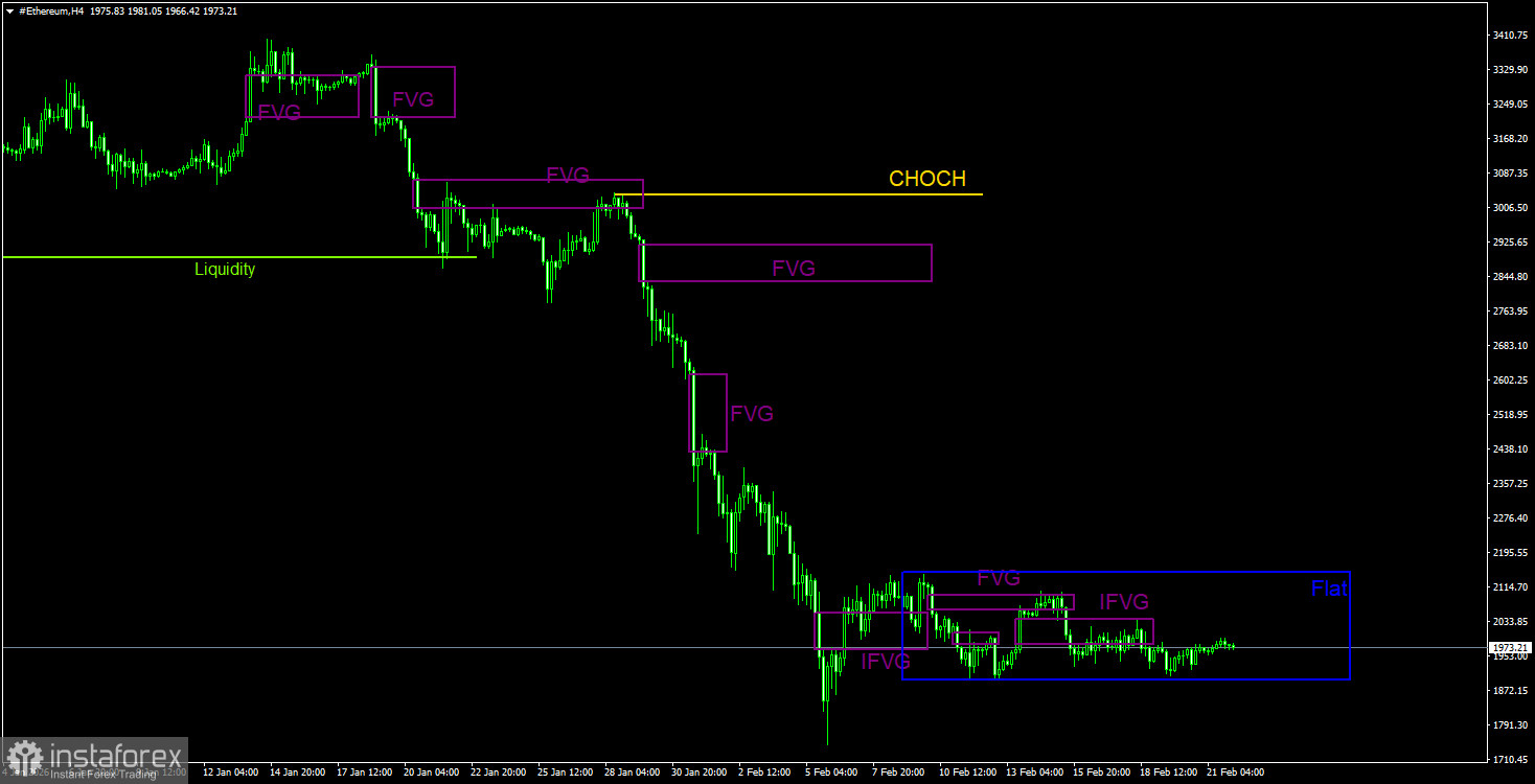 На 4-часовом таймфрейме также хорошо виден тотальный обвал, после которого началось некое подобие коррекции. В ходе последнего витка падения было сформировано три «медвежьих» FVG. Формально второй из этих FVG был отработан, что давало возможность трейдерам открывать промежуточные шорты. В данное время цена ушла во флэт, поэтому в ближайшее время трейдеры могут рассматривать только девиации около верхней и нижней линии бокового канала. Как видим, все внутренние паттерны игнорируются.