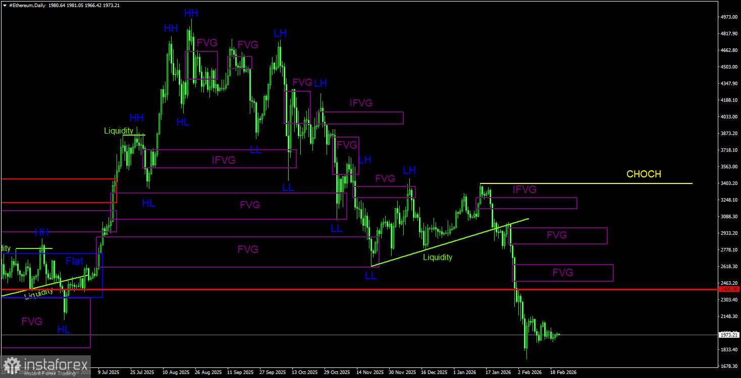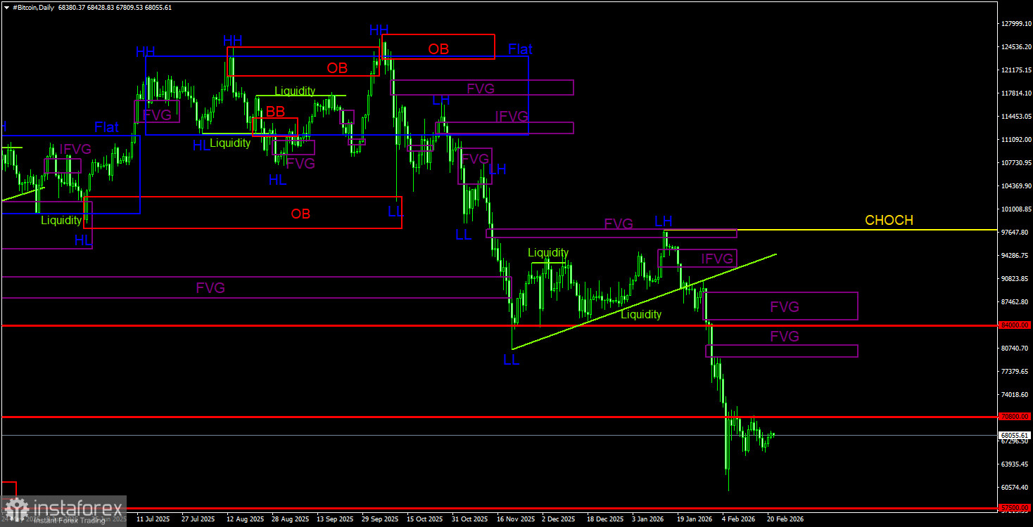 Биткоин продолжает формирование полноценного нисходящего тренда. Мы продолжаем ожидать падения с целью 57 500$(уровень 61,8% по Фибоначчи от трехлетнего восходящего тренда), а признаков разворота тренда в данное время ни одного. Но даже уровень 57 500$ теперь не выглядит, как конечная остановка. Из областей POI на продажу на дневном ТФ можно отметить последний «медвежий» FVG, до которого биткоину еще очень далеко. На 4-часовом ТФ имеется три неотработанных «медвежьих» FVG, однако эти паттерны принадлежат к предыдущему движению и располагаются гораздо выше текущей цены. Они вряд ли спровоцируют возобновление тренда.
