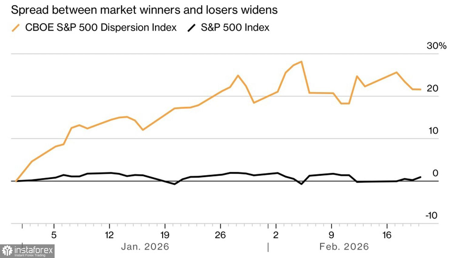 Волатильность самой изменчивой на рынке акции в 7 раз превышает волатильность S&P 500, чего на наблюдалось за последние три десятка лет. Существенное расширение разрывов показателей имело место во время мирового экономического кризиса 2008 и введения самых больших с 1930-х тарифов Белым домом на День освобождения Америки в апреле.