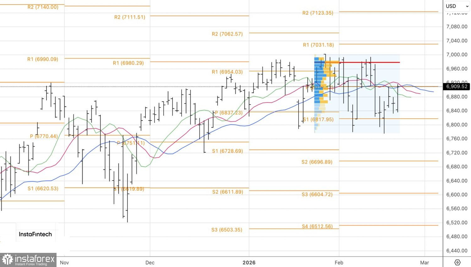 Технически на дневном графике S&P 500 продолжается среднесрочная консолидация. Без выхода их торгового диапазона 6800-7000 широкому фондовому индексу будет сложно определиться с направлением дальнейшего движения. Внутри канала имеет смысл обращать внимание на штурм сопротивления на 6910. Отбой от пивот-уровня – повод для продаж и наоборот.