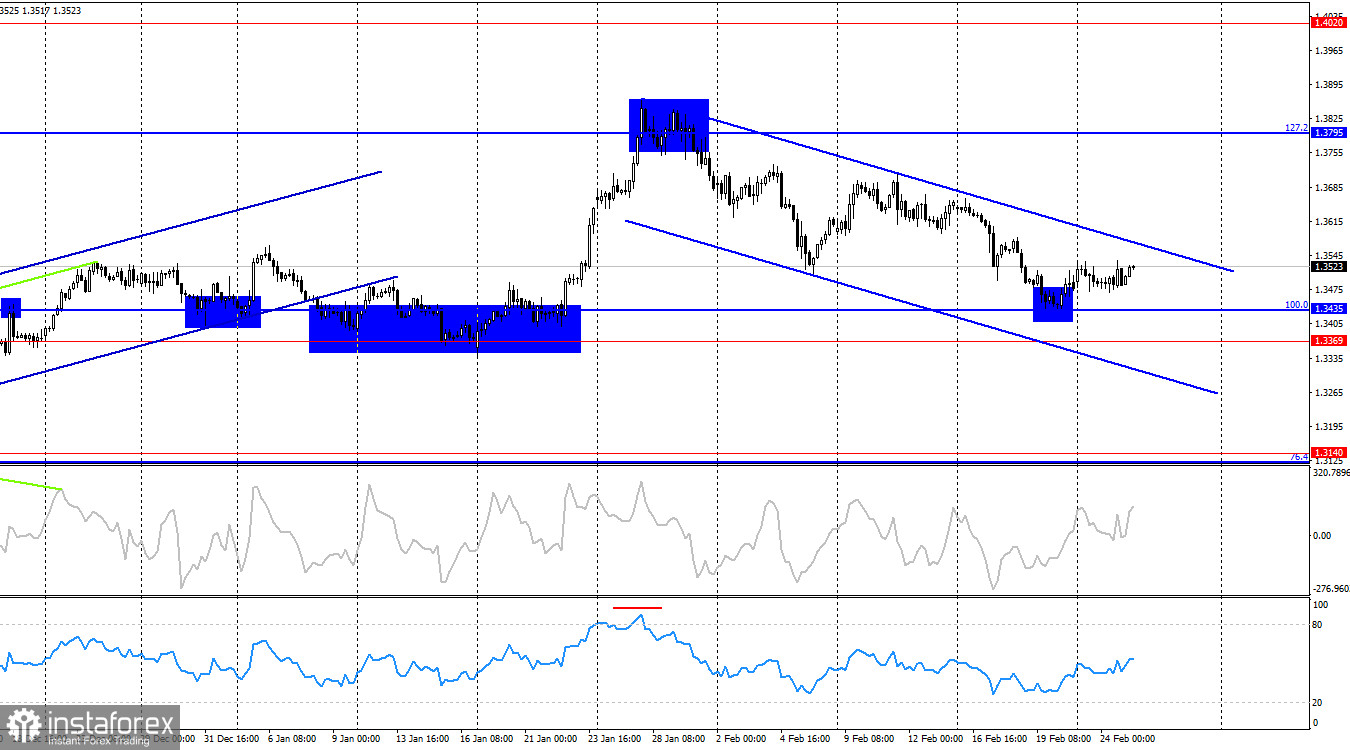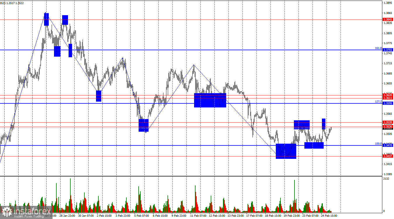 Информационный фон во вторник никакого влияния на трейдеров не оказал. Иранская проблема остается главной темой для обсуждения на рынке, поэтому даже такие события, как отмена пошлин Трампа Верховным судом США, обратное введение новых пошлин президентом США остались практически без внимания. Тем не менее, быкам удалось остановить наступление медведей, которое очень сильно затянулось. «Медвежий» тренд не будет сохраняться вечно, а информационный фон для доллара весьма противоречивый и неоднозначный, чтобы ожидать дальнейшее укрепление американской валюты. На этой неделе важные события и отчеты практически отсутствуют, чем и объясняется боковик. Лишь в пятницу выйдет несколько интересных отчетов в Германии, но к британцу они по понятным причинам отношения не имеют. Таким образом, боковик может сохраняться до конца недели. Графические сигналы – основа для торговли на этой неделе.