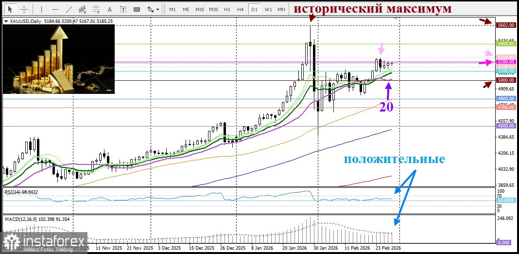 А с технической точки зрения на пути к историческому максимуму ближайшее сопротивление у золота $5200 и $5250, преодолев их, быки откроют преграды. А не удержав круглый уровень $5000, где проходит 20-дневная SMA, медведи увеличат позиции. Но пока осцилляторы на дневном графике находятся в положительной зоне, путь наименьшего сопротивления восходящий.