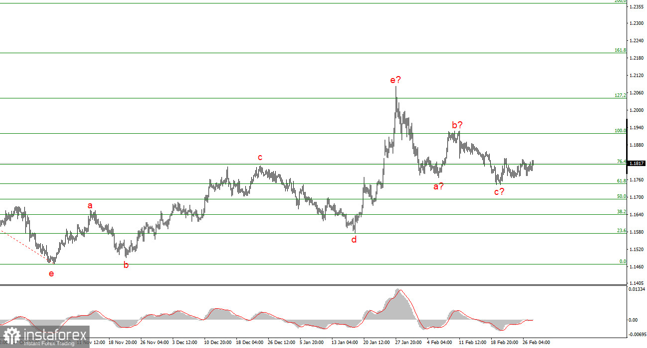 Внутренняя волновая структура предполагаемой волны 5 не совсем однозначная(верхняя картинка). Повышательный набор волн не может считаться импульсным из-за довольно сильных коррекционных волн. Поэтому на текущий момент он трактуется, как a-b-c-d-e. Однако, если волна 5 примет протяженный вид, то ее внутренняя структура тоже получится достаточно сложной. Если это действительно так, то волновая разметка трансформируется еще не один раз. Так или иначе, я жду возобновления повышения инструмента EUR/USD, а коррекционная структура a-b-c выглядит уже сейчас вполне завершенно.