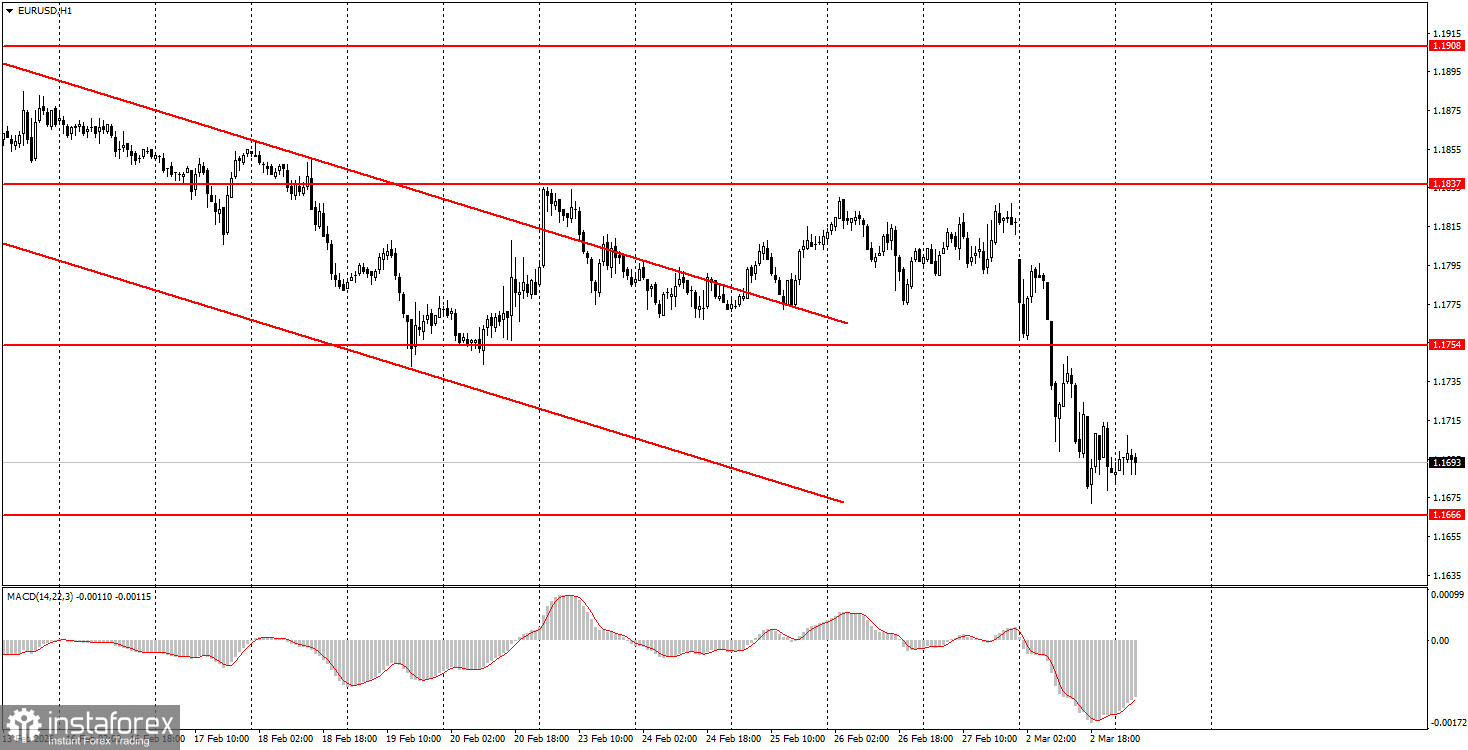Валютная пара EUR/USD в течение понедельника продемонстрировала сильное падение, что в целом было ожидаемым. Мы сомневались, что на событиях субботы и воскресения на Ближнем Востоке доллар США непременно вырастет, но это был вполне допустимый вариант. Напомним, что рынок готовился к войне на Ближнем Востоке в течение двух последних недель, когда Дональд Трамп через день угрожал Ирану массированной атакой и свержением действующего режима. Как показала практика, что-то пошло не по плану Вашингтона. Вместо разящей атаки с уничтожением лидеров Ирана и ключевых ядерных и военных объектов, Вашингтон получил ответные удары по своим базам, расположенным более, чем в 10 странах Ближнего Востока и даже на Кипре. Таким образом, уже сейчас в конфликте участвуют более 10 государств. Похоже на полноценную войну, а не на спецоперацию. Так как масштаб конфликта явно вышел за пределы планов Трампа, доллар в понедельник вновь использовался повсеместно, как защитный актив. Вполне возможно, что на этой неделе американская валюта продолжит дорожать, так как попытка начать восходящую тенденцию была разбита геополитикой.