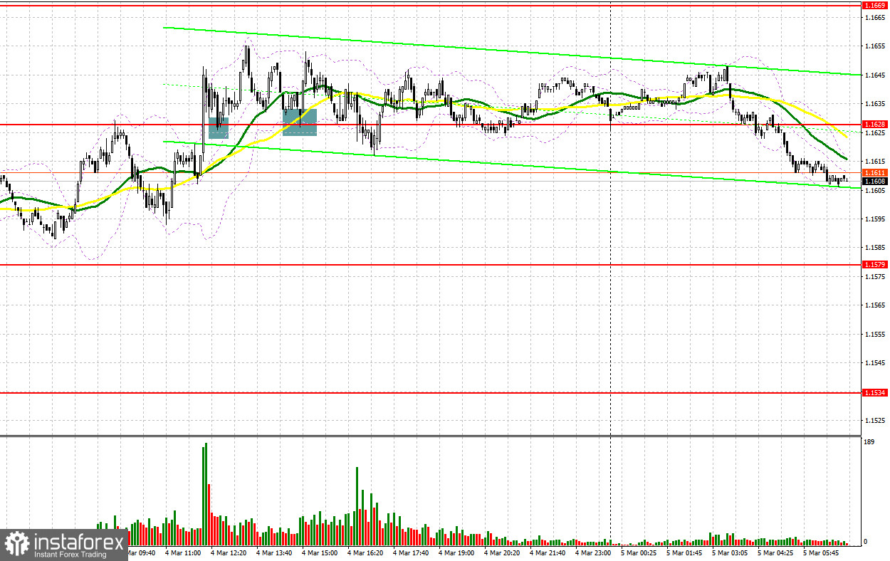 Вчера было образовано несколько точек входа в рынок. Давайте посмотрим на 5-минутный график и разберемся с тем, что там произошло. В своем утреннем прогнозе я обращал внимание на уровень 1.1610 и планировал от него принимать решения по входу в рынок. Прорыв 1.1610 состоялся, но до обратного теста дело так и не дошло. В итоге я остался без сделок. Во второй половине дня ложный пробой в области 1.1628 позволил войти в длинные позиции, что вылилось в несколько небольших восстановлений пары на 25 пунктов каждое.