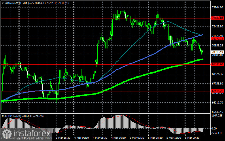 Что касается технической картины Bitcoin, то покупатели сейчас нацелены на возврат уровня $71 300, который открывает прямую дорогу на $73 000, а там уже и рукой подать до уровня 74 600. Самой дальней целью выступит максимум в районе $77 400, преодоление которого будет означать попытки возврата бычьего рынка. В случае падения биткоина покупателей жду на уровне $69 300. Возврат торгового инструмента под эту область может быстро свалить BTC в район $67 100. Самой дальней целью будет область $64 900.