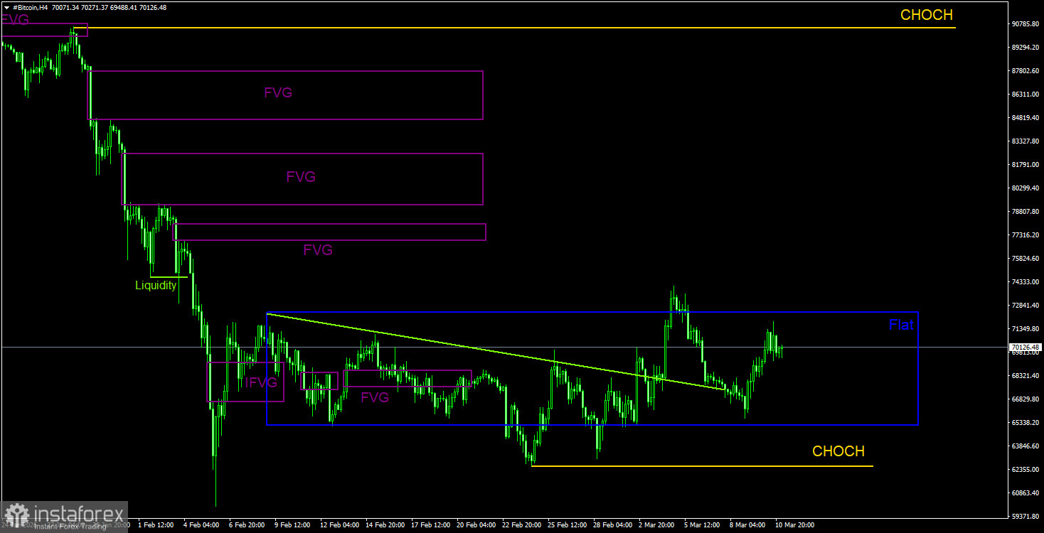 Биткоин продолжает формирование полноценного нисходящего тренда. Мы продолжаем ожидать падения с целью 57 500$(уровень 61,8% по Фибоначчи от трехлетнего восходящего тренда), а признаков разворота тренда в данное время ни одного. Но даже уровень 57 500$ теперь не выглядит, как конечная остановка. Из областей POI в данное время можно отметить только ближайший «медвежий» FVG на дневном ТФ, который располагается достаточно далеко от цены. На 4-часовом ТФ в ближайшее время стоит ожидать новой девиации верхней границы канала, так как именно к ней движется сейчас цена.