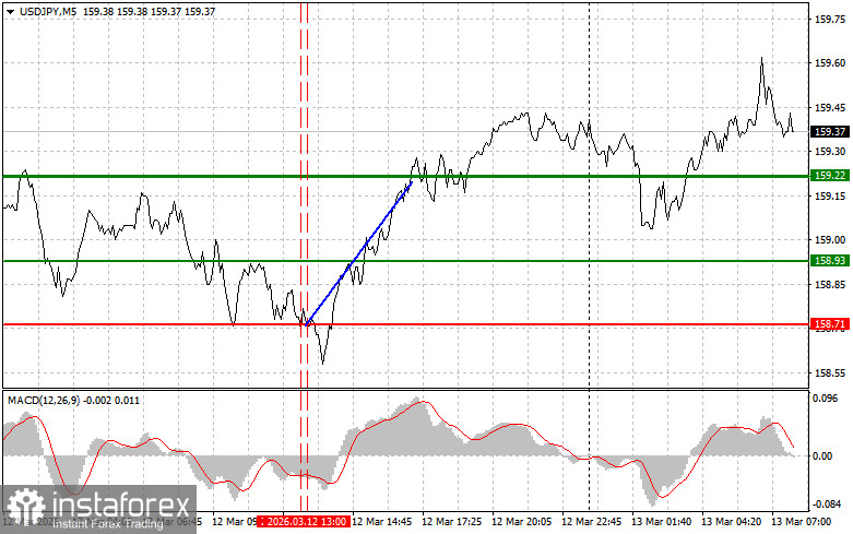 Сценарий №2: покупать USD/JPY сегодня также планирую в случае двух подряд тестов цены 159.28 в момент, когда индикатор MACD будет находиться в области перепроданности. Это ограничит нисходящий потенциал пары и приведет к обратному развороту рынка вверх. Можно ожидать рост к противоположным уровням 159.53 и 159.91.