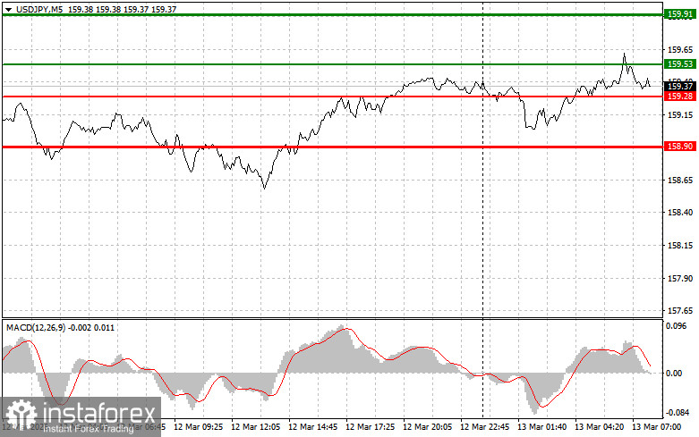 Сценарий №2: продавать USD/JPY сегодня также планирую в случае двух подряд тестов цены 159.53 в момент, когда индикатор MACD будет находиться в области перекупленности. Это ограничит восходящий потенциал пары и приведет к обратному развороту рынка вниз. Можно ожидать снижения к противоположному уровню 159.28 и 158.90.