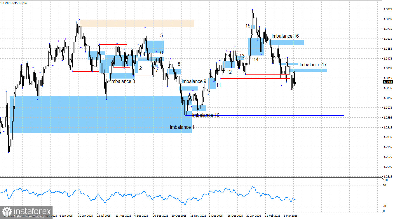 По британцу долгосрочная картина остается «бычьей». Актуальных «бычьих» паттернов в данное время нет, имеется лишь сигнал на продажу в имбалансе 17, который недолго может оказывать поддержку медведям. Еще раз напомню о хрупкости роста американского доллара. Падение пары в последние несколько недель получилось настолько сильным из-за неудачного стечения обстоятельств. Если бы Дональд Трамп не обещал через день атаковать Иран, не отправлял военные корабли в Персидский залив, а затем не начал войну, мы бы вряд ли увидели такой сильный рост доллара. Я считаю, что это падение может завершиться также неожиданно, как и началось. Однако в данное время «медвежье» наступление сохраняется. Если имбаланс 17 не будет инвалидирован, падение пары может быть возобновлено в зону 1,3000-1,3100.