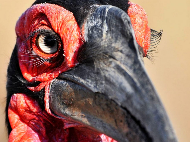 Кафрский рогатый ворон обладает, пожалуй, самыми густыми и жесткими ресницами в птичьем мире. Эти черные щетинки обрамляют глаза птицы, создавая суровый и пронзительный взгляд. Как и у птицы-секретаря, это видоизмененные перья, но у ворона они значительно плотнее и короче. Жизнь этой птицы проходит в поисках пищи среди колючего кустарника и высокой травы, где риск поранить глаза крайне высок. Ресницы ворона работают как надежный щит, принимая на себя удары веток и защищая слизистую от мусора.